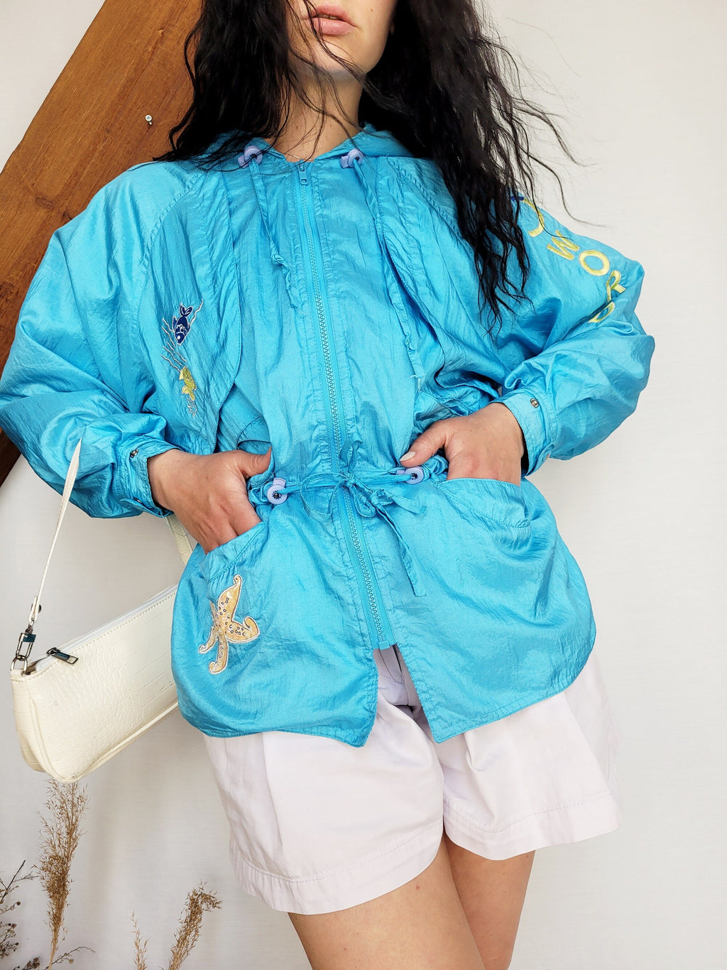 Vintage 90s blue embroidered shell hooded windbreak jacket