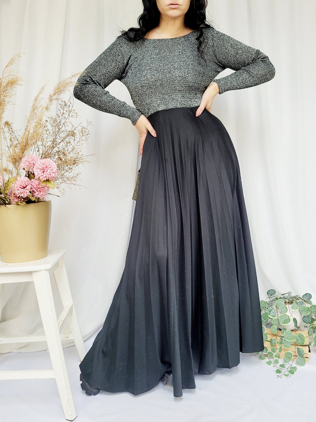 80s long sleeve shimmer knit pleated occasional maxi dress